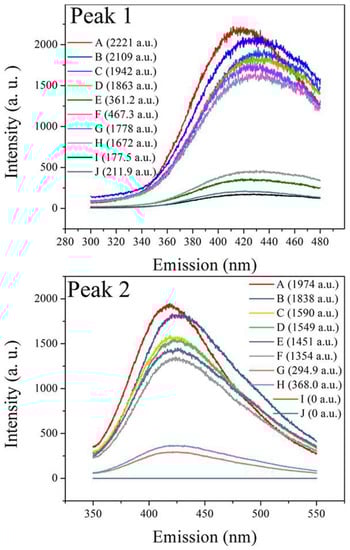 Changes in the intensity of the emission spectra of peak 1 and peak 2: (A) HA—pH 5.0; (B) HA—pH 7.0; (C) Cs+ = 3.0 mmol/L, pH =5.0; (D) Cs+ = 5.0 mmol/L, pH =7.0; (E) Cs+ = 14.0 mmol/L, pH =5.0; (F) Cs+ = 25.0 mmol/L, pH =7.0; (G) Co2+ = 0.03 mmol/L, pH =5.0; (H) Co2+ = 0.10 mmol/L, pH =7.0; (I) Co2+ = 1.3 mmol/L, pH =5.0; (J) Co2+ = 0.90 mmol/L, pH =7.0; HA = 50 mg/L.