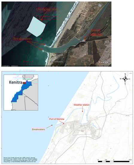 This study covers the Oued Sebou estuary area. The Sebou estuary is located on the Atlantic coast in the Kenitra region of Morocco in North Africa. It is a region where numerous coastal developments are located. Two concentrically spaced longitudinal breakwaters channel the Oued Sebou over a distance of about 800 m, extending to a bathymetric line of 7 m. The sandbar that prevents shipping in the canal was reduced by the construction of the breakwaters in 1931 (Figure 1). During low tide, these structures give the tidal current the ability (velocities and forces) to drive the sand along the shoreline in either direction. Additionally, this river is controlled by water agencies that guarantee its stability. The Mehdia beach (of the city side in the southern part of the river mouth) is surrounded by a corniche composed of a wall with an average height of 1.50 m and 2 m for the northern and southern halves, respectively. In the southern and northern beach zones, respectively, the wall’s height above sea water level (SWL) is nearly 11 and 13 m. It is also important to note that the Mehdia shoreline dune is occupied by various manmade structures.