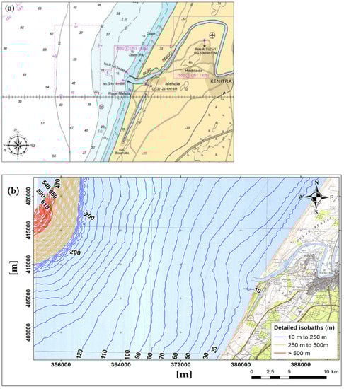 The bathymetry of the study area is generated by using the SHOM charts, SHOM7702 SHOM Nautical Charts—Morocco. Available online: https://www.nauticalchartsonline.com/charts/SHOM/Morocco (accessed on 1 February 2021).