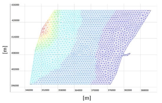 Generally, for wave simulation, the research and commercial models use flexible grid mesh (structured and unstructured grids). In previous studies [17,21], it was observed that simulations with structured or unstructured grids were substantially consistent. In this study, we use a nested regular grid with a resolution of approximately 25 m, as shown in Figure 3. The bathymetry meshing was generated by using the BlueKenue software.