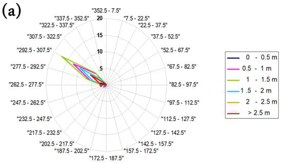 Figure 4 shows the annual wave rose of the significant wave heights (Figure 4a) and their corresponding periods (Figure 4b). The dominant wave (the most frequent) comes from the northwest (300°N to 320°N). Storm swells are more westerly and come from the west–northwest sector (280°N to 300°N). Five significant wave heights were considered in this study (results of 19-year data analysis), Hs0 = 1.5, 2, 2.5, 3, 3.5, and 4 m. Here, we denote by Hs0 the significant wave height in deep water.