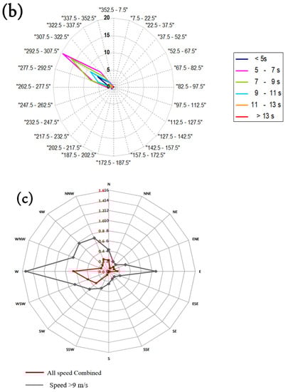 Wave rose (a) of the significant wave heights, (b) corresponding periods of the significant wave, (c) and average annual wind rose.