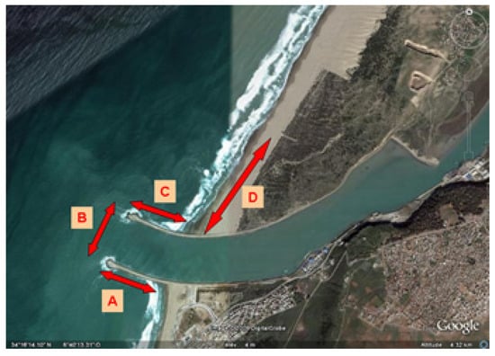 The different zones subject to analysis: stress on structures (A, C), B-agitation in the river outlet (B), littoral erosion (D).