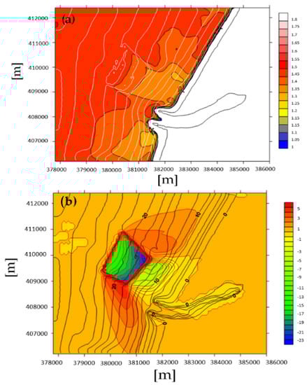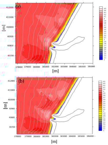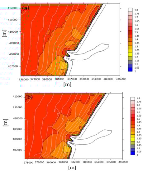 As an illustration, Figure 6 depicts the simulated outcomes of the local significant wave height (Hs) distribution, before (with current bathymetry), as shown in Figure 6a, and after dredging of 2 m, as shown in Figure 6b. The data illustrated in Figure 6 refer to case 3 (Table 2) of significant wave height in deep water Hs0 = 1.5 m and a period Tp = 8 s.