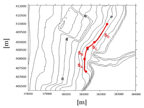 To evaluate the impact of dredging on the estuary environment, two indicators have been considered: (i) impact on sediment transport processes, where the analysis focuses on the evolution of the bottom friction velocities, responsible for the movement of sediment particles and proportional (velocity squared) to the erosion rate, and (ii) impact on structures, where the analysis focuses on the variation of the energy before the wave breaks, at each concerned zone (Figure 5). For this final point, the impact of the significant heights (squared), measured at the bathymetry of 10 m, and on each of the four selected areas was integrated. In practice, the values of Hs2 determined at different locations SA, SB, SC, and SD (Figure 8), along the isobath of 10 m, were performed to indicate the wave energy impact on the selected zones, as shown in Figure 5. A comparison was made between relative configurations with and without dredging.