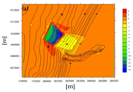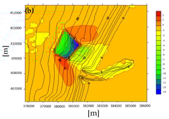 Figure 9 depicts examples of the relative bottom friction velocity (reflecting the bottom resistance) distribution in the target area. The relative friction velocity is defined as the difference between the simulated friction velocity with bathymetry with the dredged area and that without dredging (current bathymetry). The data shown in Figure 9 refer to the dredging of 2 m depth. Figure 9a shows the results of the relative friction velocity obtained with the most frequent case (Hs0 = 1.5 m, Tp = 8 s) (see Table 2), whereas Figure 9b shows that of the highest wave condition (Hs0 = 4 m, Tp = 12 s). Figure 9 shows the clear effects of the dredging on the bottom friction velocity distribution.
