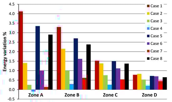 Estuary ecosystems are significantly impacted by wave energy. The bathymetry in some coastal regions causes a concentration of wave energy, which raises wave height [32]. Figure 11 displays the fraction of wave relative energy percentage that corresponds to zones A, B, C, and D (Figure 5). The energy was estimated at 10 m isobath, as shown in Figure 8, and the relative percentage of energy was determined as the difference between the energy of the simulated wave with the excavation present and without it. The percentage is in relation to the simulated wave energy without excavation. The data shown in Figure 11 relates to a 2 m-deep excavation.