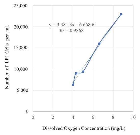 A study of cooling towers in Puerto Rico reported data that included DO levels and concentrations of Legionella pneumophila serogroup 1 (LP1) [38]. This study also reported water parameter measurements including temperature, conductivity, pH, alkalinity and hardness in addition to Legionella pneumophila concentrations. While not the focus of this study the data reported on DO concentrations in all five cooling towers were in a range that supports Legionella growth and aerobic respiration, from 4.0 ppm to 8.8 ppm. Concentrations of L. pneumophila ranged from 6,300 to 23,000 cells/mL, which coincidentally correlated with DO levels (R2 = 0.98) (See Figure 2). However, such a small data set and with all DO levels in the range that supports Legionella growth, any conclusions about the role of DO at lower concentrations cannot be supported by this study.
