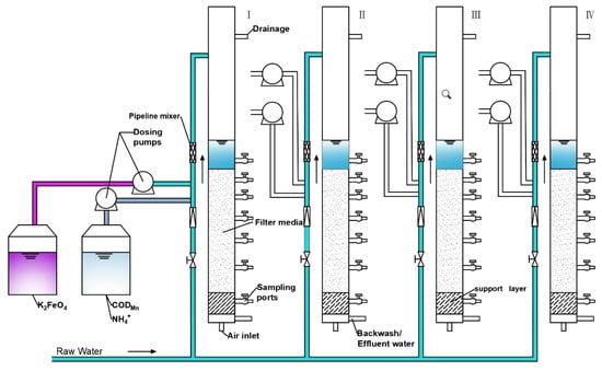 As can be seen in Figure 1, the pilot-scale filter system includes four identical filter columns (inner diameter = 0.1 m, height = 3.0 m), the dosing system, the water distribution system and the backwashing system. Using potassium permanganate to continuously oxidize manganese and ferrous ions from raw water have been used to form the MeOx on the surface of virgin quartz sand quickly [,]. There was a 30 cm support layer (70–150 mm pebbles) at the bottom of the filter column. There are seven sampling ports on one side of the filter column. Eight dosing pumps were used for dosing different chemicals, and the filtration rate was controlled by the valve. The backwashing system includes air washing and water washing, and a flow meter was set to adjust the washing intensity. When the water level reached about 2.5 m above the bed layer, or the effluent water quality deteriorated, the pilot-scale column was backwashed, and the operation method of backwashing the filter column was as in a previous study []. The same batch of filter media was replaced after each experiment was completed.