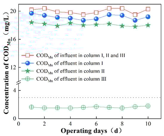 The water temperature had a significant influence on the removal of CODMn, and the removal efficiency of CODMn decreased with the decrease in temperature, as shown in Figure 6a. The removal efficiency of CODMn was only 53.92 ± 0.82% when the temperature was reduced to 6.0 °C. Since the activity of MeOx was affected by the low temperature [], the removal efficiency of CODMn was significantly reduced.