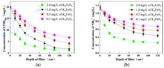 The optimal dosage of K2FeO4 was determined, and the results are shown in Figure 3a,b. As shown in Figure 3a,b, the CODMn concentration and NH4+ concentration in the effluent gradually increased with the gradual decrease in the dosage of K2FeO4. However, only 1.0 mg/L K2FeO4 was added to the influent, and the concentration of pollutants in the effluent could meet the standard, so the optimal dosage of K2FeO4 was determined to be 1.0 mg/L.