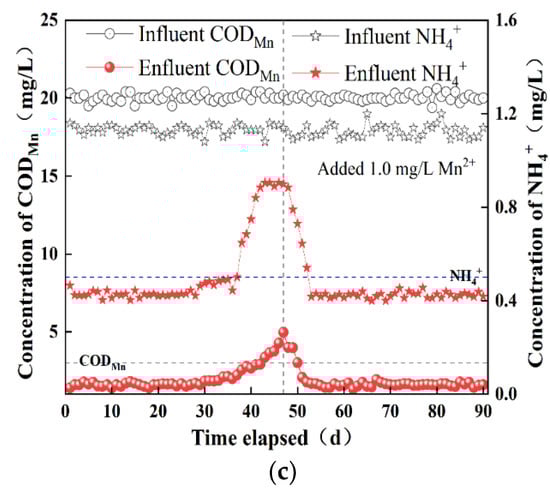 Column IV was continuously operated for more than 90 days, and the concentrations of CODMn and NH4+ in the influent and effluent are shown in Figure 3c. During the initial 30 days, the removal efficiency of CODMn and NH4+ remained stable. The concentration of the pollutants in the effluent began to gradually increase when the pilot-scale system was run for 37 days. There was no Mn2+ in the influent for a long time, and the MeOx on the surface of the filter media could not be renewed, so the activity of the MeOx gradually decreased []. Mn2+ was continuously added into the influent on the 47th day, and the concentration of pollutants in the effluent gradually decreased and returned to the same level after 5 days. The recovery of the oxide film activity could be achieved by the continuous addition of Mn2+ in the influent.