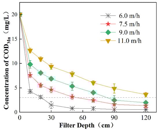The effect of the filtration rate on the removal of CODMn is shown in Figure 4. When the filtration rate was 6.0 m/h, the CODMn concentration reached the effluent standard at the 20-cm-deep filter layer. When the filtration rate increased from 6.0 to 11.0 m/h, the CODMn concentration in the effluent also increased gradually. However, the removal efficiency of CODMn was more than 80% even if the filtration rate reached 11.0 m/h, so the effect of the filtration rate on the removal of CODMn was not obvious when the filtration rate was 6.0–11.0 m/h.