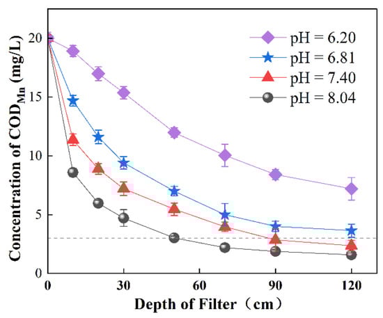 The effect of pH on the removal of CODMn is shown in Figure 5. From Figure 5, when the pH value of the influent was 6.2, the removal efficiency of CODMn was only 64.0 ± 3.2%. The removal efficiency of CODMn increased with the increase in pH value. Considering the different reduction products of K2FeO4 at different pH [], Fe3+ exists in the dissolved state under acidic conditions.