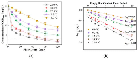 The oxidation kinetics of CODMn at different temperatures are shown in Figure 6b. By maintaining the concentration of DO and pH in the influent constant, the CODMn consumption rate was assumed to be pseudo-first order: −d[CODMn]/dt = k [CODMn], where k is the rate constant (min−1) []. The plot of log{[CODMn]t/[CODMn]0} versus empty bed contact time (EBCT) were linear at all temperatures (6.0–22.0 °C), confirming that the kinetics of CODMn oxidation was pseudo-first order.