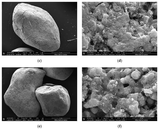 The filter media at different stages (the 1st, 47th and 90th day) were taken in column IV for the microscopic characterization analysis. As shown in Figure 7a,b, MeOx on the surface of quartz sand was smooth and dense, and the pore structure was relatively developed on the 1st day. From Figure 7c,d, the experimental system was continuously operated until the 47th day, part of the structure of the MeOx was broken, and the pore structure was blocked by some substances. It was due to the oxidation of organic matter by K2FeO4 to form the substances, which were attached to the surface of MeOx. After adding Mn2+ into the influent (Figure 7e,f), the surface structure and pore structure of MeOx were gradually recovered to smooth and dense, and the dosage of Mn2+ was oxidized to form the manganese oxides, which could be used to restore the activity of the MeOx.