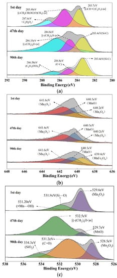 The XPS analysis was performed on the binding energies of C1s, O1s and Mn 3/2p, and the results are shown in Figure 8. By analyzing the binding energy of C1s, the organic matter was oxidized by K2FeO4 to form [(-(CH2)4O-)n] [] on the surface of MeOx; this substance is more likely caused by the addition of glucose. In addition, the Si-C content increased due to MeOx exfoliation on the oxide film surface. From Figure 8b, the Mn (2p3/2) mainly exists in the form of manganese oxides, mainly including Mn2O3 [], MnO [] and Mn3O4 []. From the binding energy of O1s, the compound form of O was gradually changed from manganese oxide to [(-(CH2)4O-)n] and a small amount of MnO [] with the dosage of CODMn. The activity of MeOx was recovered after adding Mn2+, and the compound form of O on the surface of MeOx is mainly C=O and part of Mn2O3, which was the intermediate product of CODMn after oxidation.