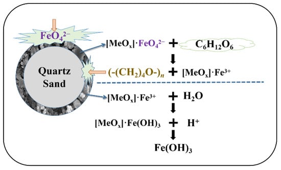 As shown in Figure 9, a schematic presentation of the removal mechanism of CODMn by K2FeO4 enhanced filtration was proposed. The enhanced filtration process of K2FeO4 could be presented as three main steps: (1) Adsorption of FeO42− onto the surface of MeOx; (2) organic matter (glucose molecules) were adsorbed to the surface of [MeOx]·FeO42−, and the reaction occurs to generate [(-(CH2)4O-)n] and [MeOx]·FeO42−, and [MeOx]·FeO42− was reduced to [MeOx]·Fe3+; (3) [MeOx]·Fe3+ was still oxidized and finally reduced to [MeOx]·Fe(OH)3, and Fe(OH)3 was released from MeOx after backwashing.