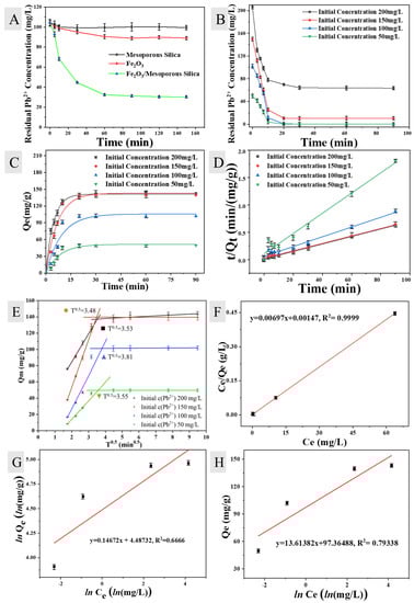 To examine the impact of the starting concentration on the removal effectiveness, the initial Pb2+ concentration ranged from 50 to 200 mg/L. The experimental settings, which ranged from 4 to 7, are given in Table S2, and the adsorption findings are displayed in Figure 2B. Both the residual Pb2+ concentrations were decreased to 0.5 mg/L after 30 min, which complied with the discharge limit for Pb2+ in Chinese wastewater (1.0 mg/L) (GB/8978-1996). With the initial Pb2+ concentration rising from 50 to 100 mg/L, Pb2+ removal capabilities rose from 49.71 to 101.65 mg/g at the adsorption equilibrium point. Under these circumstances, the active sites of mesoporous material for adsorbing heavy metal Pb2+ were excessive compared to the concentration of Pb2+ in the solution. The Pb2+ removal capabilities improved from 139.5 to 148.98 mg/g when the initial Pb2+ concentrations reached 150 and 200 mg/L, respectively. This may be explained by the rising mass transfer driving force under conditions of high Pb2+ concentration from the aquatic solution to the adsorbent surface [20].