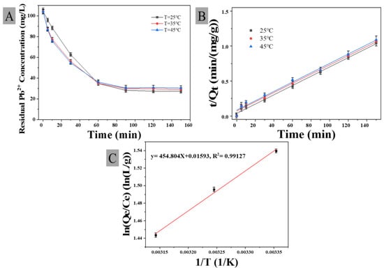 One of the important factors affecting the adsorption efficiency of heavy metals is temperature [35]. The experimental settings are provided in Table S2 in numbers 12 to 14, and Figure 3A displays the experiment’s findings on the impact temperature has on Pb2+ removal. The adsorption behaviors were similar at different temperatures. Figure 3B shows the pseudo-second-order kinetic model fitting results of the adsorption process at different temperatures. The Pb2+ removal capacities were 150.6 mg/g at 25 °C and slightly reduced to 149.9 mg/g at 45 °C. In the first 30 min of the adsorption process, the increase in temperature was beneficial to the acceleration of the adsorption rate. The thermodynamic parameters of Pb2+ adsorption behaviors were studied based on the experimental data. As shown in Figure 3C, the Gibbs free energy, enthalpy and entropy changes were calculated using the van’t Hoff equation, and the fitting results are listed in Table 5. It can be easily calculated that ∆H0 was −3.78 kJ/mol and ∆S0 was 0.1324 kJ/(mol∙K). The results indicated that the adsorption process was a spontaneous exothermic process.