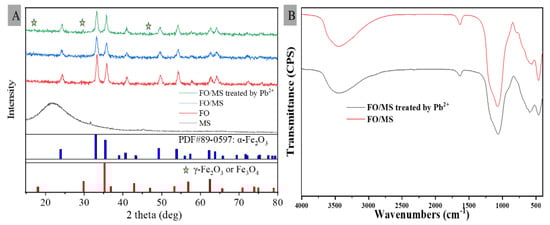 The XRD diffractogram of the as-prepared samples is shown in Figure 4A. There were no obvious diffraction peaks in the XRD diffractogram of the MS materials. Only one peak package suggested that they were composed of mesoporous SiO2 [38]. The XRD diffractograms of the FO and FO/MS materials only had a diffraction peak of α-Fe2O3. Other phase diffraction peaks were not found in the diffractogram, which might be due to the formation of mesoporous materials at high temperatures [39]. The diffractogram showed a weak diffraction peak at 30.1 as maghemite (γ-Fe2O3) or magnetite (Fe3O4) [40]. Meanwhile, there was no crystal phase of lead in the XRD diffractogram of FO/MS treated by Pb2+. Because the amount of lead adsorbed was not much, any changes might not be visible in the XRD diffractogram. This indicated that the adsorption process was physisorption, not chemisorption.
