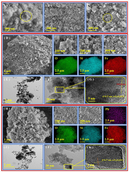The SEM graphs of ferric oxide (A), mesoporous silica materials (B), FO/MS materials (C), SEM-EDS and mapping (D), TEM (E–G) of FO/MS materials, SEM-EDS and mapping (H) and TEM (I–K) of FO/MS materials treated using Pb2+.