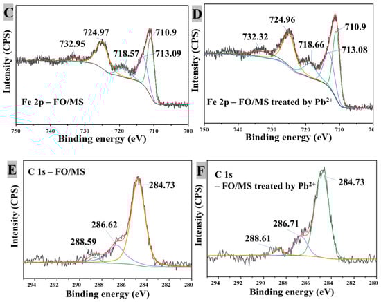 Figure 6C,D clearly shows the XPS spectra of iron. The FO/MS satellites Fe 2p1/2 and Fe 2p3/2 were placed at 710.9, 713.07 and 718.57 eV, respectively [48]. The Pb2+-treated Fe 2p1/2 and Fe 2p3/2 satellites of the FO/MS are situated at 710.9, 713.08 and 718.66 eV, respectively. This showed that Pb2+ adsorption caused a notable positive shift in Fe 2p, particularly the satellite peak shift at 718.4 eV, which was likely caused by the conversion of hematite into magnetite or maghemite. The binding energy of Fe 2p clearly differed from FO/MS, indicating that the structure of the treated Fe-O bond was changed [49]. As shown in Figure 6E,F, the C 1s spectra of the materials before and after treatment with Pb2+ were made up of three chemical states: C = O (288 eV), C-O (286 eV), and C-C (284 eV) [50]. The chemical state of C did not change after interacting with the Pb2+ solution, although their relative intensities changed. The carbon present in the samples came from the incompletely burned organic template and was brought in by calibration instruments. After the reaction with the Pb2+ solution, the chemical state of C did not change, but its relative intensity was different.