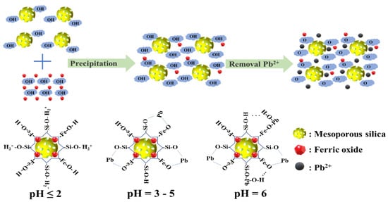 According to the above analysis and characterization, there was a possible mechanism for Pb2+ removal, as described in Figure 7. Firstly, mesoporous silica prepared via biotite leaching slag had a high specific surface area and mesoporous channel microstructure. Mesoporous silica and ferric oxide were co-precipitated to form a composite material denoted as FO/MS. Then, many hydroxyl-functional groups were exposed on the surface of FO/MS materials as active sites for the adsorption of heavy metal ions. The adsorption was mainly through complexation and electrostatic interactions between the surface hydroxyl group and the heavy metal ions. When the pH value of the solution was lower than 2, the hydroxyl group on the surface of the FO/MS material was protonated and positively charged. An electrostatic repulsion occurred between the protonated hydroxyl group and Pb2+. When the pH dropped below 6, most of the lead was present in the solution as Pb2+, which indicated that the electrostatic attraction and complexation between FO/MS and Pb2+ could readily happen. The Pb2+ in the solution was exchanged with protons on the surface of the adsorbent. Moreover, some of the Pb2+ combined with the hydroxyl group to form Pb(OH)+ for a pH value of 6. In addition to the electrostatic action, there were Van der Waals forces to promote the interaction of Pb(OH)+ with the -Si-OH and -Fe-OH groups in the adsorption process.