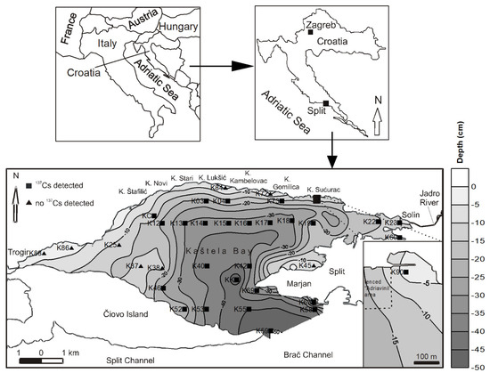 - Lovrenčić Mikelić, I.; Oreščanin, V.; Škaro, K. Variation of sedimentation rate in the semi-enclosed bay determined by 137Cs distribution in sediment (Kaštela Bay, Croatia). J. Environ. Radioact. 2017, 166, 112–125. [Google Scholar] [CrossRef]