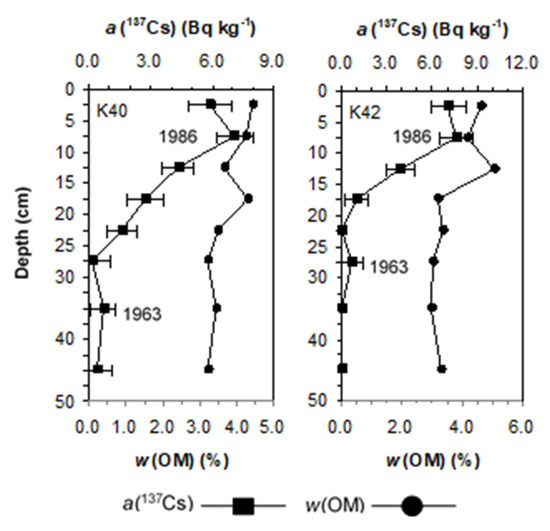 Undisturbed 137Cs massic activity profiles with peaks representing sediment surfaces of 1963 and 1986 and organic matter mass fraction profiles. Measurement uncertainties are expressed with k = 2 for normal distribution.