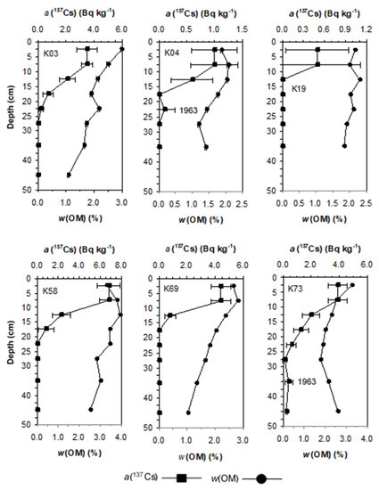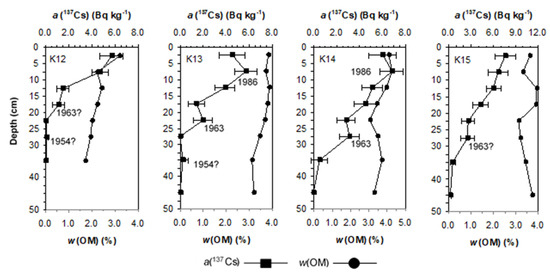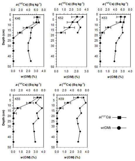 Slower sedimentation may be associated with lower content of fine-grained particles carrying 137Cs. This is supported by the occurrence of sand in the K46 and K52 profiles (Table 4). Additionally, the relatively low organic matter contents in all five profiles shown in Figure 3 (1.86–3.79%) also imply lower content of fine-grained particles in comparison with the K40 and K42 profiles. However, sand has not been visually observed in the field in K53, K55, and K59 profiles (Table 4). The K55 and K59 are shorter than the K46, K52, and K53 profiles. 137Cs was only detected in the three upper segments of the K55 and K59 profiles. This suggests even slower sedimentation of the fine-grained sediment at these two stations than in the other three. The main influencing factors, in this case, would be the sea bottom depth and the energy level of the water or the supply of sedimentary material. Although organic matter content, and probable fine-grain size particles content, were higher in the K55 and K59 profiles (2.64–3.79%) than in the other three profiles (1.86–3.33%) (Figure 3), the sedimentation at the K55 and K59 stations was slower. It is due to the significantly greater sea bottom depth at K55 and K59 (Figure 1, Table 1) and the lower energy level of the water with decreased fine sediment supply. The relationships between the energy level of the water, the supply of the fine-grained particles, and sedimentation rates have been described by Tissot and Welte [54]. The K53 profile can be regarded as an intermediate case between the K46 and K52 profiles on the one side and the K55 and K59 on the other side. Its sea bottom is deep enough that fine-grained sediment may be deposited, and 137Cs was detected in the four upper segments, such as in the K46 and K52 profiles, but it is not too deep to limit the supply of fine-grained particles. Stations K55 and K59, on the other hand, mainly display profiles of clay and silt.
