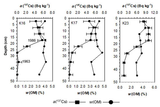 A pronounced 137Cs activity increase was observed in the K16 profile from a 30–25 cm to a 20–15 cm depth (Figure 5). It was assumed that the 137Cs peak at a 20–15 cm depth represented the sediment surface of 1986 and that after 1986, faster sediment deposition occurred. This was represented by four upper segments at a 20–0 cm depth. A somewhat similar profile was observed at the K17 station (Figure 5), where relatively uniform 137Cs activities were determined in the four upper segments (0–20 cm depth). A profile that was almost identical to K17 was observed at the K23 station, where rather uniform 137Cs activities were determined at a 5–20 cm depth (Figure 5).