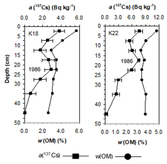 Figure 6 shows that the organic matter profiles are almost identical at both stations and that increase in 137Cs activity corresponds with an increase in organic matter content in the uppermost segments. This strongly suggests that the increased amounts of organic matter, most probably originating from wastewaters and partly transported by the Jadro River, have bound more 137Cs and were deposited with other fine-grained particles. More suspended material provides more particles for 137Cs binding. The significant association between 137Cs and organic matter is shown in Figure 10. It should be noted that the K1801 segment showed the highest organic matter content (with extreme values excluded) (5.63%). The high organic matter content at these two stations is in accordance with the fine-grained sediment observed in the field (Table 4). Increased organic matter content suggests increased fine-grained particle content as well [49]. Predominantly fine-grained sediment was documented near the K22 station by Bogner and Matijević [49]. Sediment at their A station at a 20 m depth contained, on average, 89% silt and clay particles. The similarity of 137Cs and organic matter profiles in Figure 6 also suggests that 137Cs might have been mobilised from the Jadro River catchment area after 1986 and transported to the Bay together with increased amounts of organic matter. Rubio et al. [52] observed 137Cs mobilisation from the catchment area of the Palmones River and identified it through organic matter and 137Cs profiles.
