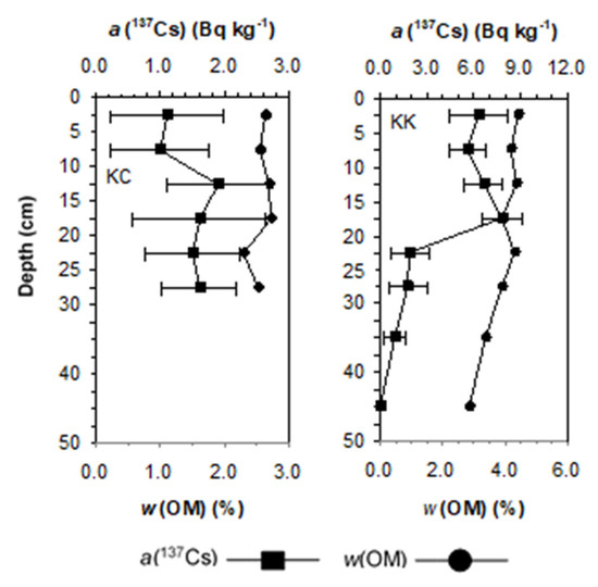 Untypical profiles reflecting anomalies in sedimentation processes were observed at the KC and KK stations (Figure 8). 137Cs activities in the KC profile were generally low, and the associated measurement uncertainties were higher than in the KK profile. However, the uncertainties were uniform along the whole profile, allowing individual activities to be comparable along the whole profile. A significant decrease in 137Cs activity was observed between the 15–10 cm and 10–5 cm depth in the KC profile. The opposite trend related to 137Cs activity variation was observed in the KK profile, implying different processes. At this station, a significant increase in activity was recorded between the 25–20 cm and the 20–15 cm depth.