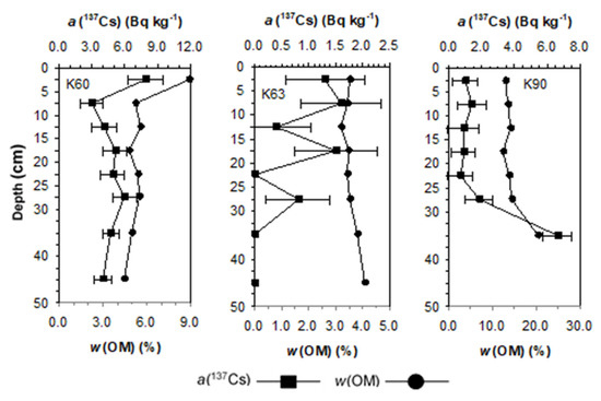 The basic statistical data for the organic matter found in the studied sediments are given in Table 5. Extreme values were found in the following segments: K6001, K9001, K9002, K9003, K9004, K9005, K9006, and K9007. These values were elevated and were in the 8.93–20.2% range. The most significant difference between the data with and without the extreme values is the maximum value. It was 20.2% for all of the samples but only 5.63% when the extreme values were excluded. Without the extreme values, the highest organic matter contents were found in the K1801, K4203, K6002, K6003, K6005, and K6006 subsamples (Figure 2, Figure 6, Figure 9 and Figure 10). The results for data sets for only the samples with detected 137Cs (i.e., 137Cs activity above the MDA) and excluded extreme values for organic matter and for data sets for only samples with no detected 137Cs (i.e., 137Cs activity below the MDA) are given separately in Table 5. The differences between the two data sets are clear. Mean value, median, and maximum are significantly lower in the samples with no detected 137Cs: 1.84, 1.85, and 2.43 times, respectively. The relative measurement uncertainties for organic matter fractions were less than 3%, for k = 2 for normal distribution. They were too low to be shown in Figure 2, Figure 3, Figure 4, Figure 5, Figure 6, Figure 7, Figure 8 and Figure 9.