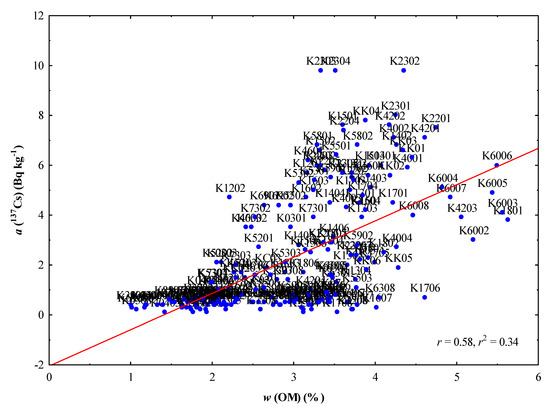 The relationship between the organic matter mass fractions (with the extreme values excluded) and 137Cs activities is presented in Figure 10. A linear relationship is observed, with a real significant positive correlation (r = 0.58). The obtained p-value was less than 0.05.