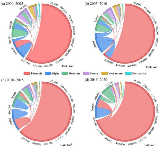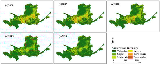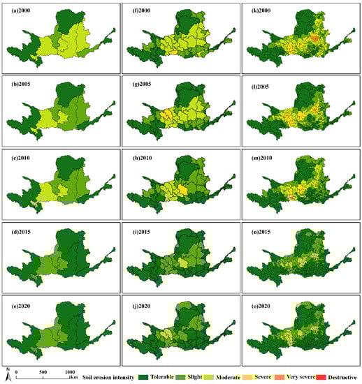 - In 2000, 2005, 2010, 2015, and 2020, the soil erosion modulus in the YRB were 1877.69, 1641.59, 1485.25, 844.84, and 832.07 t·km−2·a−1, respectively. The soil erosion modulus of YRB showed a downward trend as a whole, and the downward trend was the most obvious from 2010 to 2015.