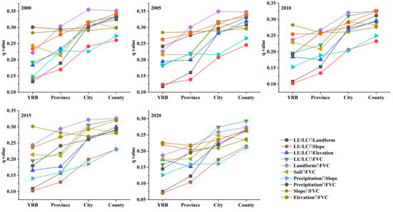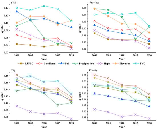 - The overall q value of soil erosion drivers in the YRB showed a decrease trend, but the ranking of LU/LC in the influencing factors kept rising. From the YRB scale to the county scale, the q values of the influencing factors tend to increase, and human activities can have a greater impact on soil erosion at smaller scales.