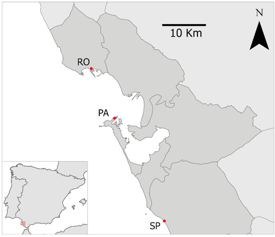 Map of the study area showing the three sampling marinas, Puerto de Sancti Petri (SP), Puerto de Rota (RO) and Puerto América (PA), in the Bay of Cádiz (Spain).
