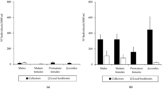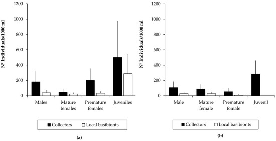In the case of P. pusilla, this introduced caprellid species was detected in the marina of Sancti Petri after one month, representing the first record of the species in the locality. After its first reported occurrence, the species became the most abundant among the caprellids found in the Sancti Petri marina after three months (Table 2 and Table S1). Regarding the population structure of P. pusilla, all of the sex/age groups considered were far better represented in the collectors than in the local basibionts (Figure 5), determining the dominance of juveniles followed by males, mature females, and premature females in populations colonizing collectors.