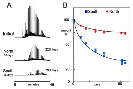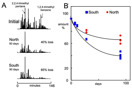 Figure 1A shows representative total ion chromatograms of the gasoline before and after 90 days of incubation in water from the North and South Arms, while Figure 1B shows that the apparent half-life of the gasoline was about 60 days in the South Arm (16% salinity), and more than 100 days in the saturated conditions (34% solids) of the North Arm.