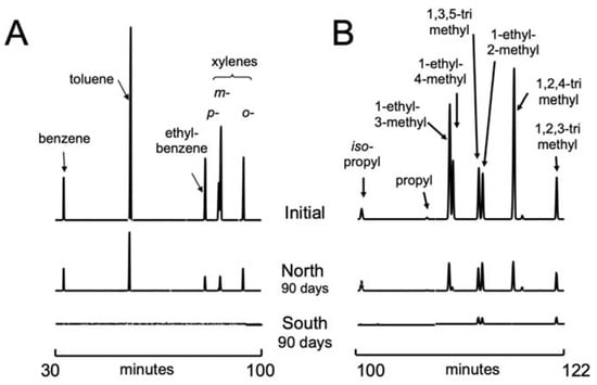 Biodegradation of BTEX (A) and the C3-benzenes (B) in gasoline in water from the South and North Arms of the Great Salt Lake after 90 days of incubation. Panel (A) shows the chromatograms of ions (m/z) 78 (benzene) and 91 (toluene and the others), while Panel (B) shows the chromatograms for m/z = 105.