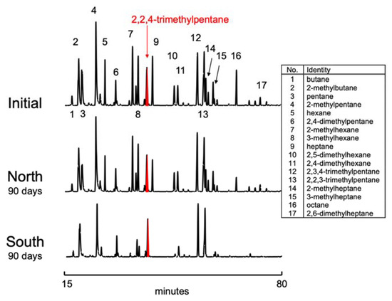 Purge-and-trap selected ion monitoring (m/z = 43) chromatograms of C4 to C8 alkanes in the initial gasoline, and of gasoline exposed to water from the South and North Arms of the Great Salt Lake for 90 days of incubation. The chromatograms are normalized to 2,2,4-trimethylpentane (iso-octane), shown in red, and the principal components are identified.