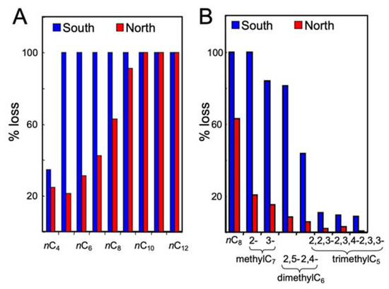 Gasoline alkanes were also extensively degraded in water from both arms of the lake, and again rather more extensively in the South Arm; Figure 3 shows an example of the data, normalized to 2,2,4-trimethylpentane. Figure 4A shows the loss of n-alkanes, while 4B shows that branched alkanes are degraded less effectively as branching increases. The loss of trimethylpentanes in this figure is close to the resolution of the analysis, which is based on the conservation of 2,2,4-trimethylpentane, but the data are consistent with earlier work that the other trimethylpentanes were degraded slightly faster than the 2,2,4-isomer in fresh- and sea-water [12]. Cyclic alkanes were degraded in both Arms of the Lake (Table 1), although we saw no evidence for the degradation of 1,1-dimethylcyclohexane, which was amongst the more recalcitrant hydrocarbons in our work with fresh- and sea-water [12]. It is notable that this compound contains a tertiary carbon.