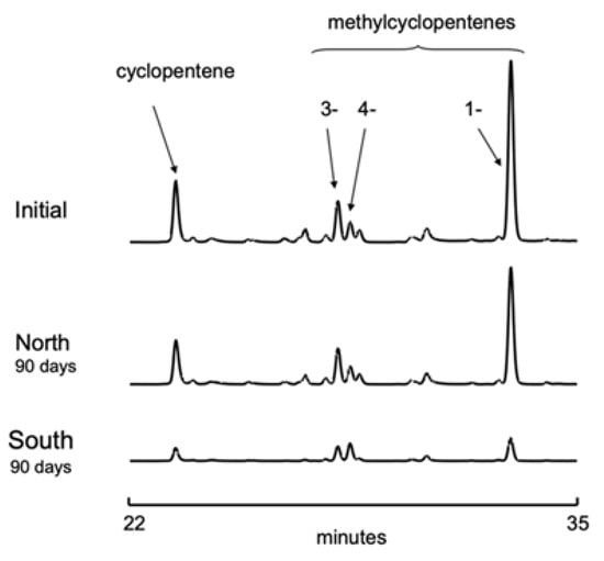 Purge-and-trap selected ion monitoring (m/z = 67) chromatograms of cyclopentenes in the initial gasoline, and of gasoline exposed to water from the South and North Arms of the Great Salt Lake for 90 days of incubation. The chromatograms are normalized to 2,2,4-trimethylpentane (iso-octane).