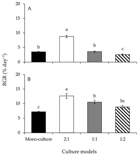 The RGRs of Gracilariopsis lemaneiformis (A) and Sargassum horneri (B) cultured for twelve days at mono-culture and co-culture with biomass density ratios of 2:1, 1:1, and 1:2. Different lowercase letters represent significant differences (p < 0.05) among culture models.