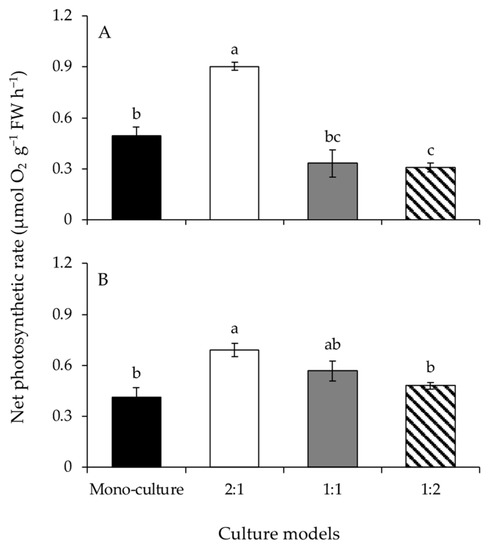 The net photosynthetic rates of G. lemaneiformis differed significantly among culture models (Figure 2A and Table 1). The net photosynthetic rate at BDR of 2:1 was significantly higher than those of the other culture models. Additionally, the net photosynthetic rate at BDR of 1:2 was significantly lower than that at mono-culture. The net photosynthetic rates of S. horneri were significantly affected by culture model (Figure 2B and Table 1). The net photosynthetic rate at BDR of 2:1 was significantly higher than that at mono-culture. However, the net photosynthetic rates decreased significantly with increasing biomass of S. horneri, from BDR of 2:1 to 1:2.