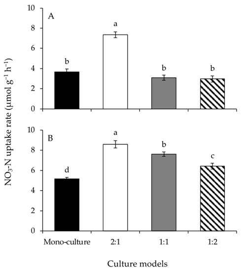 The NO3-N uptake rates of Gracilariopsis lemaneiformis (A) and Sargassum horneri (B) cultured for twelve days at mono-culture and co-culture with biomass density ratios of 2:1, 1:1, and 1:2. Different lowercase letters represent significant differences (p < 0.05) among culture models.