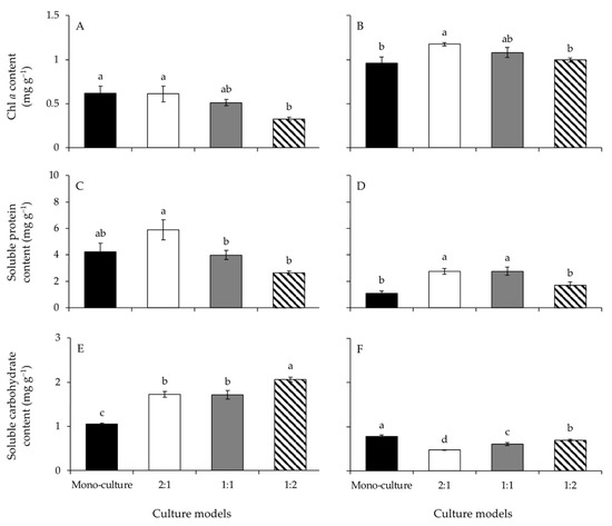 The contents of Chl a, soluble protein, and soluble carbohydrate of Gracilariopsis lemaneiformis (A,C,E) and Sargassum horneri (B,D,F) cultured for twelve days at mono-culture and co-culture with biomass density ratios of 2:1, 1:1, and 1:2. Different lowercase letters represent significant differences (p < 0.05) among culture models.