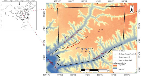 The Hetaoyu coal field is located in Zhengning county in the southeastern city of Qiangyang, Gansu Province. It belongs to the Longdong Loess Plateau, and the landform is mainly composed of the Loess plateau area, Loess ridge, and valley area. As shown in Figure 1, the altitude is generally 889 to 1310 m. The plateau height decreases gradually from 1300 m to 1170 m with higher elevation in the north and east. The valley area mainly consists of Jinghe River and its tributaries, including Wuritiangou River and Silang River. Jinghe River Valley is about 210 m lower than the Loess Plateau.